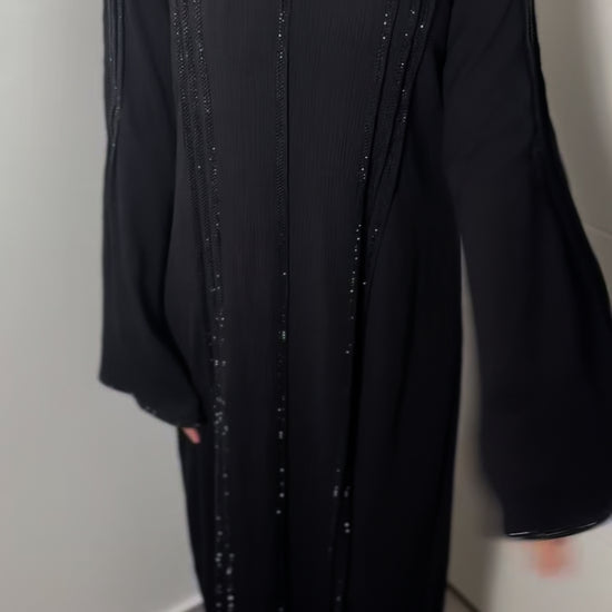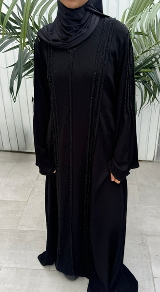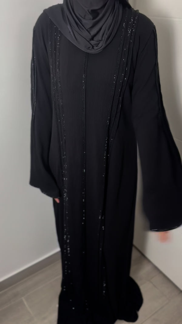Cette abaya est simple et ajustable à la taille, avec un tissu légèrement pailleté et des manches ornés de détails brillants.